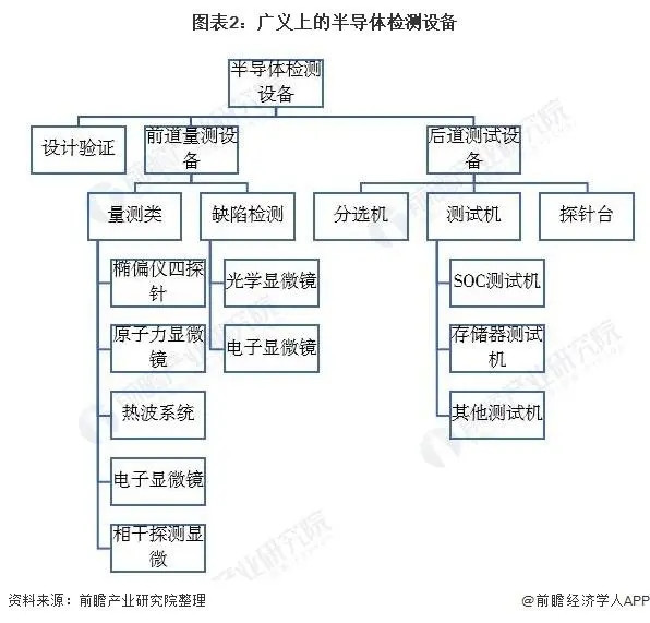 前道檢測設備又包括量測類和缺陷檢測類,量測類包括橢偏儀四探針、原子力顯微鏡、熱波系統、相干探測顯微等,缺陷檢測類包括光學顯微鏡、電子顯微鏡等;而后道檢測設備主要包括分選機、測試機、探針臺。