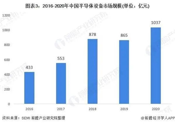 前瞻初步推測,中國半導體設備市場規模在2020年恢復增長,約為155億美元(約為1037億元),占到全球半導體設備市場規模的22%左右。